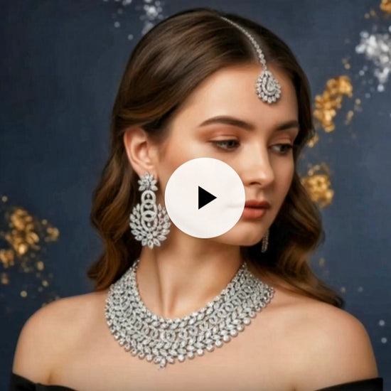 Royal Austrian Diamond Rhodium-Plated Choker Necklace Set with Maang Tikka & Earrings – Timeless Luxury for Women & Girls